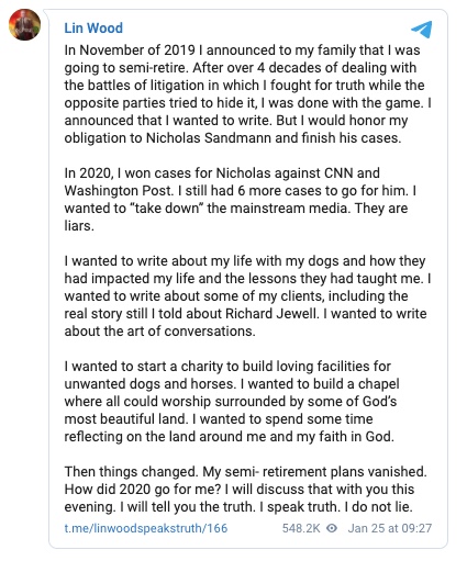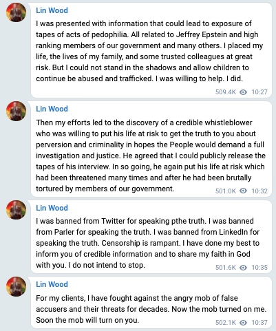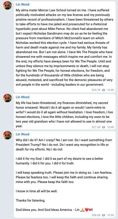 私の母校、マーサー・ロースクールが私に矛を向けました。私の弁護士免許、過去の功績が政治的圧力により攻撃を受けており、私は苦境に立っています。マイク・ペンスを非難したことで、私を起訴して刑務所に入れると脅迫を受けています。私を見限ったクライアントは1人もいませんでした。しかし、ニコラス・サンドマンはミッチ・マコーネル(上院議員・共和党のボス)のチームの手先から圧力をかけられているので、私を裏切るかもしれないと予想しています。私と私の家族は深刻な脅迫を受けてきました。私の家族は私を捨てました。しかし、私は一人ではありません。私にはたくさんのメッセージをくれ、奮い立たせてくれ、励ましてくれる民衆が付いています。結局のところ、私の努力は全て民衆のためのものでした。連中が投獄や死で私を黙らすまで、私は民衆のため、公正な選挙のため、自由のため、そして、我が国の権力者達を含む世界中の邪悪な人間達の悪魔的な享楽のために虐待され、性的搾取され、犠牲になっている何十万人もの小さな子供達のため、私は決して戦うことをやめない。